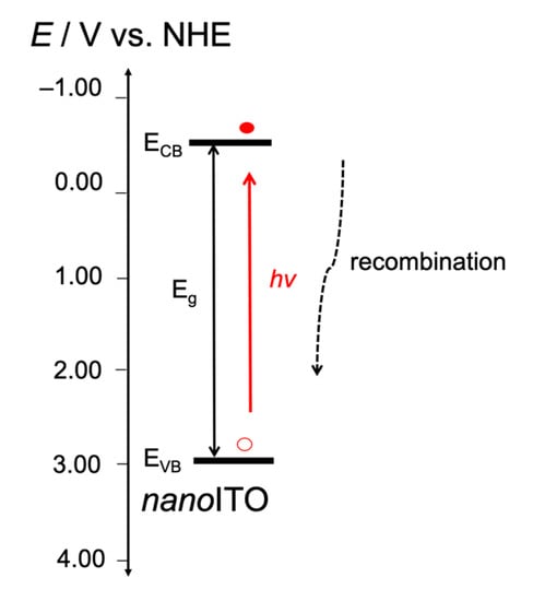 The proposed energy diagram for the photo-electrochemical process following the light absorption by nanoITOs in buffer-only system performed at 1.0 V. The electron–hole separation that occurred in competition with electron recombination, leading to the sharp decline in the photocurrent, as shown in Figure 5b. The nanoITO conduction band (ECB) −0.77 V SCE or equal to −0.53 V NHE followed that reported previously []. The band gap energy (Eg) +3.45 eV was estimated from the Tauc plot derived from the UV–visible spectrum at 1.0 V, as given in Figure S8.