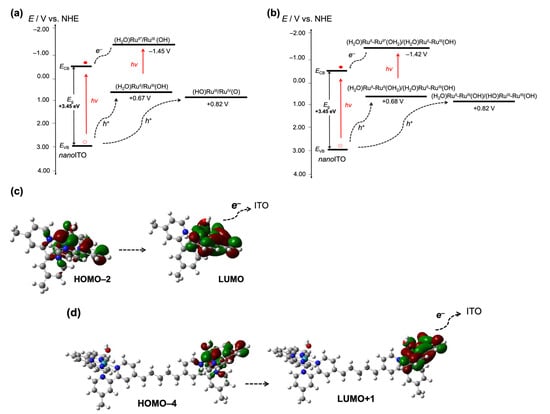 (a) The proposed energy diagram representing the photo-electrochemical processes occurring on nanoITOs in the presence of 1-H2O during the photolysis at 1.0 V. The created hole was extracted through RuII(OH2) to form RuIII(OH) then RuIV(O). The visible light absorption using RuII(OH2) caused its excitation and subsequent electron injection to form RuIII(OH); (b) the proposed energy diagram representing the photo-electrochemical processes occurring on nanoITOs in the presence of 2-H2O during the photolysis at 1.0 V. The created hole was extracted through (H2O)RuII–RuII(OH2) to form (H2O)RuII–RuIII(OH) then (HO)RuIII–RuIII(OH). The visible light absorption using (H2O)RuII–RuII(OH2) caused its excitation and subsequent electron injection to form (H2O)RuII–RuIII(OH). The ground-state potentials were determined from the CV data, while the excited-state potentials were determined from the equation E*/+ = E0 (RuII/RuIII) – E0-0 [,], where E0-0 was obtained from the intersection between absorption and emission (Figure S9). The nanoITO conduction band (ECB) −0.77 V SCE or equal to −0.53 V NHE followed that reported previously []. The band gap energy (Eg) +3.45 eV was estimated from the Tauc plot derived from the UV-visible spectrum at 1.0 V as given in Figure S8. []; (c) the surface plots of the dominant H–2 → L transition in 1-H2O showing the electron distribution in terpyridine and H2O ligands of the L state; (d) the surface plots of the dominant H–4 → L+1 transition in 2-H2O (trans-trans isomer) showing the electron distribution in terpyridine and H2O ligands of the L+1 state.
