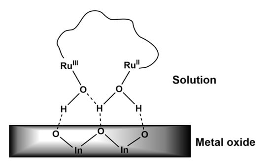 The above energetics data were consistent with the previous study, which reported that electron injection by the surface-bound ruthenium complexes into ITO nanoparticles was bias-dependent, and was due to the overlap between the conduction band of the nanoparticles and the the RuIII/RuII* energy []. In the present investigation, the very low IPCE values observed for both 1-H2O and 2-H2O suggested that the formation of the respective oxidized products through this photo-electrochemical process did not occur effectively. One possible cause was the ineffective electron injection into the nanoITO conduction band in the solution–metal-oxide interface because of the lack of an anchoring group or binding unit, such as carboxylic acid or phosphonic acid, which would otherwise facilitate a better electron injection [,,,]. Nevertheless, the dominant H–2 → L transition in the 1-H2O and H–4 → L + 1 transition in 2-H2O rendered the characteristic metal-to-ligand transition in both complexes, where the electron of the LUMO states of both molecules was localized in the terpyridine and aqua (H2O) ligands (Figure 10c,d). Thus, although the binding unit to nanoITO was absent, the accumulation of electrons in the terpyridine and H2O ligands of the excited states of the molecules suggested a possible electron injection through these moieties. The superior steady-state photocurrent shown by 2-H2O associated with the accumulation of the stable photo-oxidized product (H2O)RuII–RuIII(OH) proves that the photo-electrochemical properties of the ruthenium complexes in the solution–metal-oxide interface was structure-dependent. Although the electron injection capacity of both complexes was energetically favorable, the photo-electrochemical enhancement shown by 2-H2O was the likely consequence of its structure. The two coordination sites in 2-H2O possessed different redox characters that were bridged by a flexible alkyl chain, which may have caused a “chelating effect” that directed the orientation of the –OH- and –H2O-rich coordination sites towards the metal oxide through hydrogen bonding as shown in Figure 11. While the “chelating effect” was absent in 1-H2O, through this effect, 2-H2O molecules in the solution interacted better with the nanoITO surface, which led to the facile photodeposition of the oxidized form of the molecule on the surface of the metal oxide.