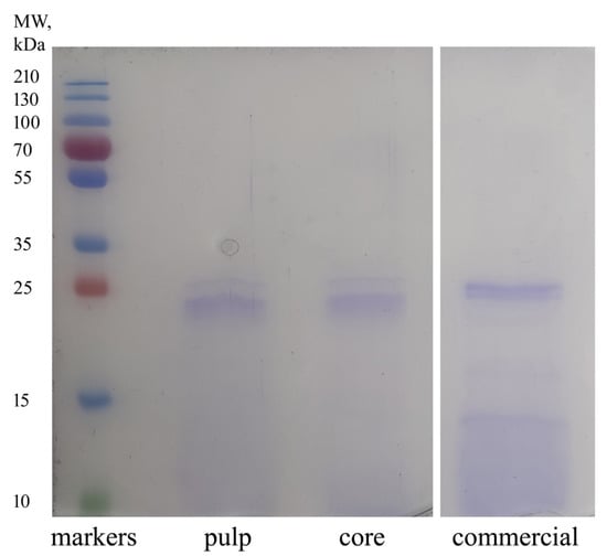 Proteins in the extracts were separated by SDS-PAGE that provided very similar tracings for the various samples, with a main protein band at around 23–25 kDa (Figure 2). This indicates that proteins extracted from the fruit flesh and core were almost the same and most likely corresponded to bromelain. In this frame, our results are comparable to those obtained in previous studies, where bromelain from pineapple core and pulp were reported to be 26 kDa and 23 kDa, respectively [2,25]. A commercial bromelain preparation (Merck, Milan, Italy) was used as a reference and showed a slightly different electrophoretic pattern than that of our extracts. In particular, the SDS-PAGE tracing of the commercial preparation is characterized by a main protein band with a molecular weight of ∼25 kDa but also by a number of bands at lower MW that might result from proteolytic degradation. Differences in the electrophoretic pattern might be due to differences in terms of post-translational modifications and/or proteolytic maturation between the proteins present in our extracts and those in the commercial sample. As for these issues, the bromelain source (e.g., fruit, core, stem) and the specific pineapple variety, harvesting, and ripening stage are to be considered [26,27].