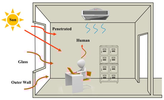 where represents the hourly cooling load formed by the heat transfer through the external walls, represents the hourly cooling load formed by the heat transfer through the temperature difference of the external windows, represents the hourly cooling load formed by the solar radiation heat entering the room through the glass windows, and represents the cooling load caused by the heat dissipation from occupants.