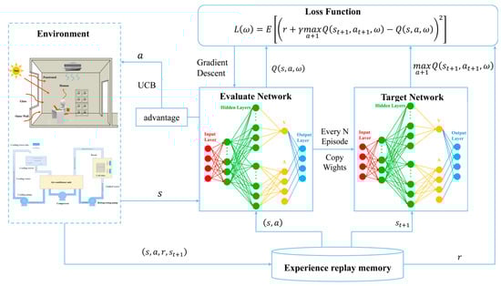 Furthermore, the variance of air conditioning data can lead to environmental variance [], thereby reducing learning efficiency and causing learning instability and overfitting. To address this problem, this research introduced the advantage function based on the DQN algorithm, aiming to mitigate the impact of air conditioning data variance on environmental variance. This approach enhances learning stability, improves learning efficiency, and prevents overfitting. In the proposed simulation environment of the central air conditioning system, to enhance the robustness of the environment and reduce the gap between the simulation environment and the real environment, this research introduced noise perturbation. However, the presence of noise perturbation can introduce errors in the sampling results. When using the DQN algorithm, traditional ε-greedy exploration cannot avoid the issue of error data, leading to decreased learning efficiency and increased instability. To address this problem, this research adopted the UCB algorithm, which aims to balance the trade-off between exploration and exploitation. It assigns confidence to each action based on its potential value and uncertainty. By calculating and selecting the action with the maximum UCB value based on confidence, this research effectively solved the problem of sampling result errors caused by noise.