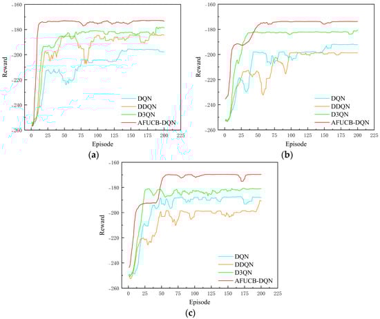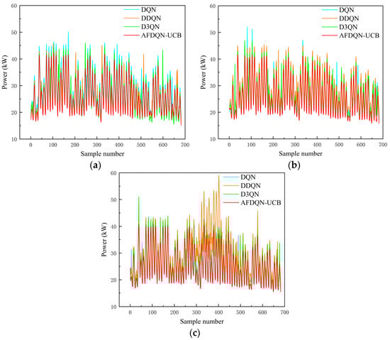 Figure 6 shows the convergence of different algorithms at different room temperatures. It can be observed that, compared with other algorithms, the AFUCB-DQN algorithm exhibits more stable convergence and faster convergence speed under different indoor temperatures, and is able to obtain higher rewards. This can be attributed to two main aspects. First, the AFUCB-DQN algorithm has a better exploration–exploitation balance ability than the DQN algorithm and the DDQN algorithm. The traditional DQN algorithm and DDQN algorithm can only learn the Q-value of taking a specific action in a specific state. When the actions taken in certain states have no significant impact on the final return, the learning time will be wasted. Secondly, the DQN algorithm and the DDQN algorithm use the ε-greedy strategy to explore, but in the face of complex environments with noise, the effectiveness of exploration is low. The AFUCB-DQN algorithm effectively overcomes the shortcomings of the traditional ε-greedy strategy in noisy environments by combining the advantage function and the UCB algorithm. Such improvements enable the algorithm to better cope with complex building cooling load simulation environments, improve the effectiveness of exploration, and achieve more stable and rapid convergence performance. Compared with the D3QN algorithm, although the D3QN algorithm can use the advantage function to consider the value and uncertainty of each action, it still cannot avoid the error data problem when using the ε-greedy strategy for exploration in an environment with noise. Therefore, during the exploration process, the D3QN algorithm may be affected by a certain degree of error data. To sum up, the AFUCB-DQN algorithm, by introducing the consideration of the UCB algorithm and the advantage function, can more effectively solve the problem of error data in the exploration process than the D3QN algorithm, and improve the learning efficiency and stability. It should be noted that the cumulative rewards of the DQN algorithm, DDQN algorithm, and D3QN algorithm are not stable enough, because the existence of the ε-greedy strategy provides a certain probability that the algorithm will explore other non-optimal behaviors, resulting in oscillations.