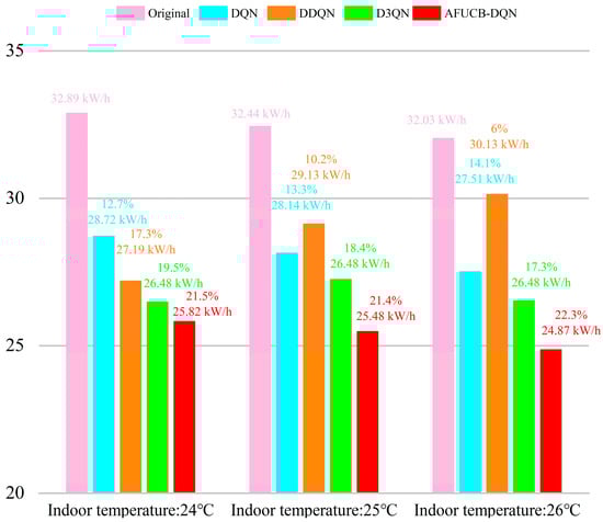 Figure 7 illustrates the energy consumption of different algorithms for each sample at different indoor temperatures. It can be observed that the AFUCB-DQN algorithm consistently achieves significantly lower energy consumption compared to the DQN algorithm, DDQN algorithm, and D3QN algorithm. Additionally, the AFUCB-DQN algorithm demonstrates stable energy-saving performance. To provide a more intuitive representation of the energy-saving effect, Figure 8 presents the average hourly energy consumption of the DQN algorithm, DDQN algorithm, and D3QN algorithm, and of the AFUCB-DQN algorithm, in the central air conditioning system at indoor temperatures of 24 °C, 25 °C, and 26 °C. The figure also indicates the percentage reduction in energy consumption achieved by each algorithm compared to the original energy consumption. Therefore, while meeting the thermal comfort requirements of different individuals during the summer, the AFUCB-DQN algorithm exhibits significant energy-saving benefits compared to the DQN algorithm, DDQN algorithm, and D3QN algorithm.