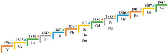 Rare Earths Elements (REEs) are commonly associated with designing and developing sustainable technologies to meet human demands and standards of living. REEs are also recognized as critical minerals by some researchers and agencies. The REEs are the comprehensive series of elements in the IIIB group in the periodic table, with atomic numbers ranging from 57 to 71. These elements are also referred to as the lanthanide series, starting from Lanthanum to Lutetium. Further, Scandium (21 atomic number) and Yttrium (39 atomic number) are often considered to be part of the REE group [1,2]. The age-old classification of REE consists of the Ceric group (C.G.) with elements from La to Eu and the Yttric group (Y.G.) with elements from Gd to Lu including Y, the reason behind this is related to their solubility differences [3]. Additionally, Sc and Y are considered among the REEs because of their coexistence in common REE-bearing minerals and resembling properties [4]; in contrast, some authors argue not to include Sc with the rest due to ionic radii variation [5]. Later on, based on industrial applications, metallurgists classified the REEs/REMs into three groups: light/Ceric REEs from Lanthanum (La) to Neodymium (Nd), middle REEs from Samarium (Sm) to Gadolinium (Gd), and heavy REEs from Dysprosium (Dy) to Lutetium (Lu). Some of the literature uses terms like yttric REEs, which include Middle REEs, and heavy REEs, and yttrium is also considered a heavy REE because of its similar properties [6]. Figure 1 describes the chronological timeline of REE discovery.