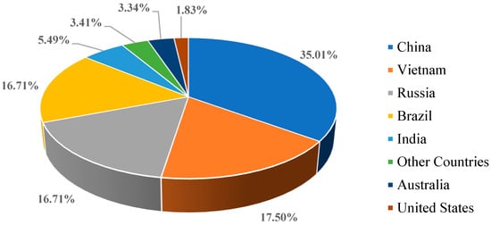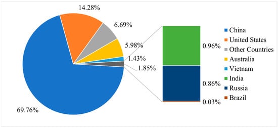 The natural abundance (values averaged in μg/g except for Pm) of REEs in the earth’s crust was in the order of Ce > Nd > La > Y > Sc > Pr > Sm > Gd > Dy > Er > Yb > Eu > Ho > Tb > Lu > Tm [4]. As indicated in the report from the United States Geological Survey (USGS)(https://www.usgs.gov/centers/national-minerals-information-center/rare-earths-statistics-and-information (accessed on 27 March 2023)), the most widely available mineral sources for REE are monazite, bastnaesite, and xenotime. The USGS report states that the minable and extractable quantity of world REE-oxides reserves worldwide is 130,000,000 metric tons, the mined production in 2021 was 290,000 metric tons, and in 2022 it was 300,000 metric tons. As shown in Figure 2, the statistical analysis of data on REE reserves from the USGS report for the year 2022 depicts China has the maximum amount of REE reserves and the United States of America has a lesser amount of REE reserves, but not the least. The data of other countries include the cumulative reserves for Canada, Greenland, South Africa, and Tanzania. Similarly, Figure 3 represents the worldwide production of REE oxides for 2022, which informs that China has the maximum share in the REE production market, thus emerging as the global REM supply chain controller. It is worth mentioning that in Figure 3, the data of other countries include the production details of both Burma and Madagascar.