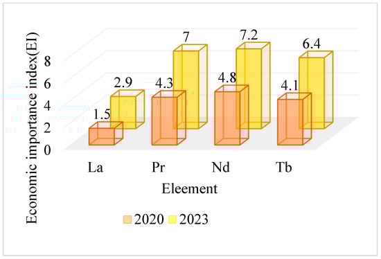The increase in population across the globe has increased the demand for utility vehicles, electronic gadgets, pharmaceuticals, fuel, and energy resources. Many countries have accommodated these demands with care and concern for the environment by adopting the transformation to using clean and green energy alternatives. This emerging transition once aroused the need for rare earth supply chains and production. As cited, 75% of REEs are utilized in industries of catalysts: 10% for ceramic, glass, and polishing industries; 10% for phosphor and other optical devices; and, finally, 5% for alloy design required for wind turbines, hard disk drives, and many others [2]. According to categorization by the E.U., Sc and LREEs (referring to La–Sm) are preferred for the sectors of catalysts, metallurgy, polishing, and magnets, and HREEs (referring to Eu–Lu and Y) are used in lasers (but not only limited to) and niche applications [17]. The E.U. Criticality Assessment report for 2023 states that compared to 2020, in the E.U., there has been a 50% increase in the economic importance of La, Pr, Nd, and Tb due to their usage in magnets and catalysts, and the comparison is presented in Figure 4.
