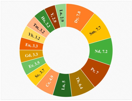 Data in Figure 5 represent the statistical analysis of the economic importance of REEs for the E.U. as of the year 2023, and it is essential to note the data described here are on a point scale, but not on a % scale. Additionally, the plot indicates that within the European Union (EU), there is a dire need for Dy, Sm, Nd, Pr, and Tb, as these metals possess economic importance values exceeding 5.0. The supporting explanation for this emerging requirement can be understandable from Figure 6, where the orange bar on the chart explains the details of the REE metal applications for different industries as of 2023, and the blue bar represents the data for 2012. This analysis is performed from the E.U. study for Critical raw materials [17,18]. Here, the rise in demand is mainly due to a jump in the utilization of REE metals in magnets, which are used in mobile phones [19], and hard disk drives [4]. Further, the increased application of REEs for catalysts such as La can increase the recovery in oil refineries, and Ce-based catalysts can reduce the pollutants and toxic gases released from cars [18], and, additionally, the application of REEs in ceramics is increased due to the application of REE oxides of Pr, Nd, Y, and Ce in manufacturing tiles and electronic components such as capacitors [20].
