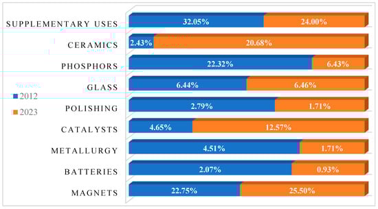 Comparison between applications of REE elements in various industrial sectors for 2012 and 2023.