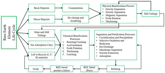 Starting from the discovery of REE minerals, many scientists, industries, capitalists, and countries across the globe have invested vast amounts of knowledge, energy, time, and money in inventing and developing an Efficient-Easier-Economical-Environmentally safe (EEEE) strategy to extract these minerals for human sustainability and the circular economy [21]. Of these inventions, the most common technologies adopted by most processes from source to recycling are shown in Figure 7. As mentioned in Section 1.1.1, the concentration of REE varies by the type of deposit and, thus, the processing. In recent publications, some researchers have outlined the process of REE production from pre-concentration to refining [2]. A detailed description of each of these techniques is discussed in the subsequent sections.