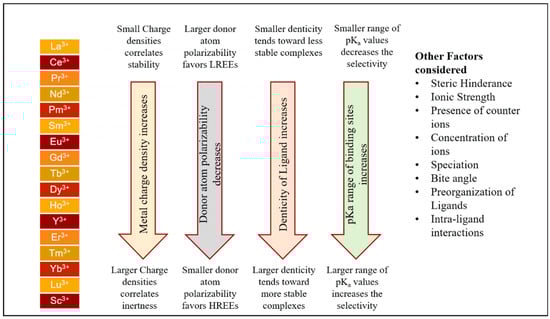 Additionally, it was noted that chelate stabilities also depend on the extent of the hydration layer of the REE ions in a solution [37]. Other than these factors, additional experimental variables include the strength of the ligand, ionic strength, and the hindrance caused by the steric bulk can also impact the logβ [35]. Anions of the soft bases such as nitrates, chlorides, and sulfates will only be able to produce outer-sphere complexes that are weaker in nature. Moreover, there are no such or lower logβ values of complex formation for ammonia and disulfide. Also, the interaction between these anions and a molecule is noteworthy only at high concentrations above 1 M; this is not true in the case of sulfate solutions, due to their higher logβ values; in addition, these sulfate solutions can form REE (SO4)2−, which is a negatively charged complex at higher sulfate concentrations. In the presence of hard ligand groups, creating additional bonding with softer bases, such as amine groups, is feasible. The complexing stability usually increases from La to Eu or Gd. However, for HREEs like Gd, they reach a maximum and plateau [38]. Due to their large size, REE ions can form a limited number of complexes. Ligands with high chelation capacities and the ability to attract small-sized REE cations with increased charge density can form stable and water-soluble complexes. An overview of factors influencing ligand design is presented in Figure 8.