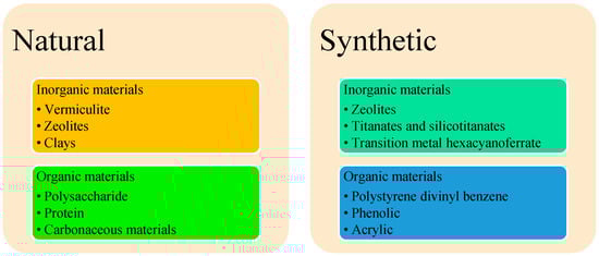 The ion exchange techniques offer another approach to REE separation. The ion exchange (IX) process separates the desired ions from the solution/slurry with the help of either organic/inorganic materials [49]. Researchers have categorized IX media into natural, modified natural, and synthetic [50]. The additional classification is shown in Figure 9. As for inorganic materials, they can be clays and zeolites; the primary difference between them is layering for clays, and the porosity for zeolites [26]. Most of the ion exchange process uses resins with a porous network with embedded functional groups for enhancing selectivity. In most recent reviews, the list of commercial resins is tabulated [35].