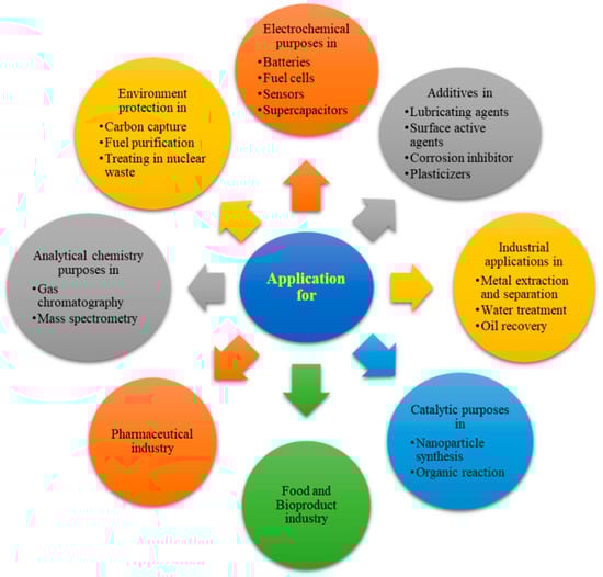 - Kaur, G.; Kumar, H.; Singla, M. Diverse applications of ionic liquids: A comprehensive review. J. Mol. Liq. 2022, 351, 118556. [Google Scholar] [CrossRef]