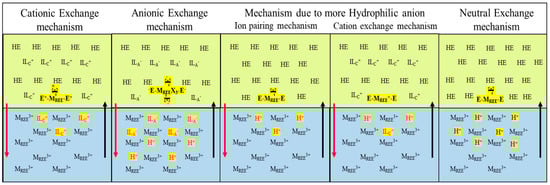 The process of IX is cyclic, with two primary steps of loading and elution. In this, the desired ions are extracted from PLS in the loading phase and are loaded into the resin phase, and the resin is removed from the liquid. Subsequently, an elution operation is performed to exchange the loaded ions into the eluent to obtain a purer form of the target ions. This operation can be performed either in batch or continuous process. The loading step can only be effective in separating the REE from other dissolved ions (like Cd, Mg, Fe, etc.) in the system but is difficult to use to fractionate into individual REE elements. Thus, an effective IX process needs a supporting selective elution that uses a complex solvent to desorb the loaded metals, and the degree of selectivity in the elution is a factor of logβ and the type of complex solvent. The most commonly used solvent is EDTA, which typically elutes REEs in decreasing order of atomic number due to the increasing stability constants of the complexes from light to heavy REEs [51]. In recent studies, the separation of REE from sulfate solutions has been studied using conventional resins (CVRs), chelating resins (CRs), solvent-impregnated resins (SIRs), hybrid organic mineral materials (HOMSs), and ion-imprinted polymers (IIP).