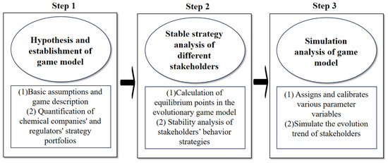 Evolutionary game theory overcomes the limitations of traditional game theory and incorporates finite rational participants into the study. In the process of chemical safety production, chemical enterprises make safety investment the key to ensure safe production, and it is necessary for government regulators to supervise chemical enterprises in order to ensure social safety. Government regulators and chemical enterprises, as finite rational game subjects, have different strategies to participate in the game, and both subjects have related interests and conflicts. Therefore, this paper analyzes the dynamic game process of the regulators and chemical enterprises as the subjects of a finite rational game. The research framework for this paper is shown in Figure 1, and the following hypotheses are proposed for the research problem of this paper: