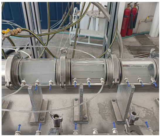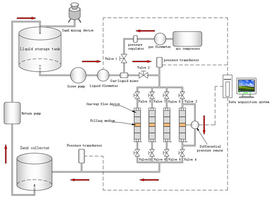 To analyze the plugging characteristics of packing media by sand-carrying fluids under different conditions, an experimental apparatus for evaluating the sand-retention and plugging mechanism under underground gas–water mixed flow was established. The apparatus principally included a one-way flow device (composed of multiple transparent glass tubes connected with clamps to observe one-way flow), a sand-loading device, a screw pump, an air compressor, a liquid-storage tank, a liquid flowmeter, a gas flowmeter, pressure transducers, differential pressure sensors, a pressure test and acquisition system, and a pressure regulator, as shown in Figure 1, Figure 2 and Figure 3.