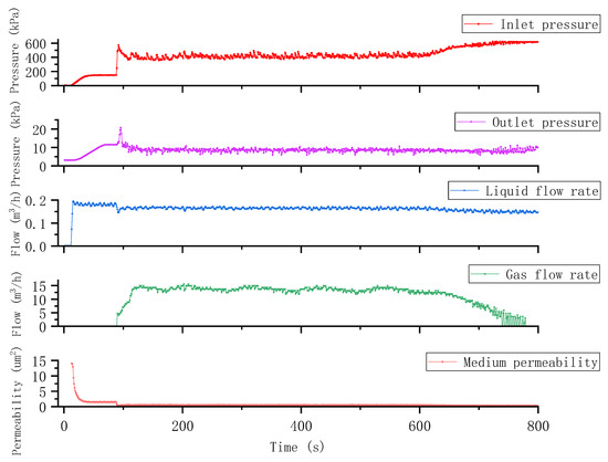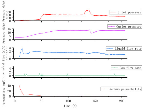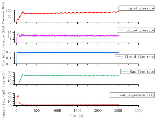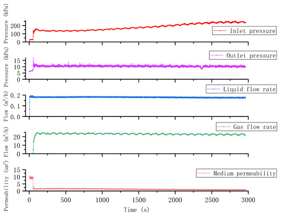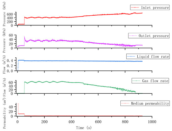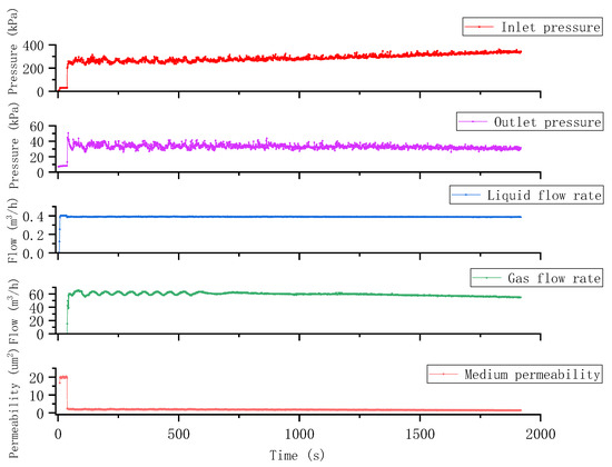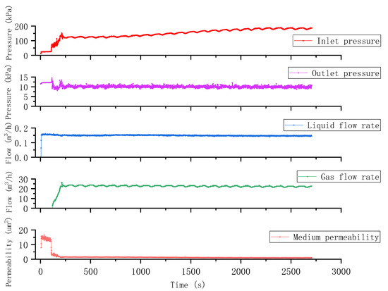 Five groups of experiments were performed on quartz-sand packing media (experimental curves are shown in Figure 6, Figure 7, Figure 8, Figure 9 and Figure 10). In the one-way flow device, differential pressure sensors were connected to the upper and lower ends of the region of the packing media. The flow-pressure drop of the packed layer was measured under the sand-production conditions of the simulated formation. In the meantime, the pressure difference in the two ends was recorded in the experimental process. Pressure transducers were also set at the inlet and outlet, to display the variation in the pressure in real time during the experimental process. Recording the parameters, including the pressure and flow rate, can reflect seepage in the packed layer. After the five groups of experiments on quartz-sand packing media were completed, two types of experimental results were obtained: one is that the quartz-sand-packed layer is plugged, with no gas produced at the outlet; the other is that the quartz-sand-packed layer is not plugged, with gas and water produced at certain flow rates.