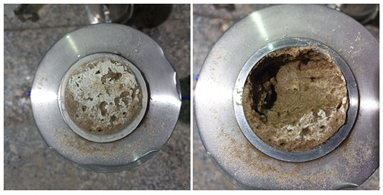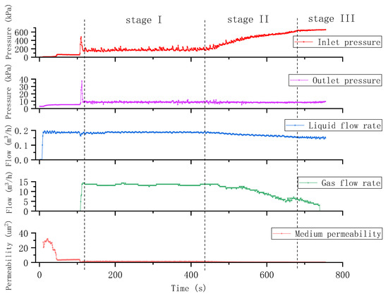 Taking Scheme S3 as an example, in this scheme of a quartz-sand-packed layer, the packed layer is finally plugged. The curves for dynamic changes in the inlet pressure, outlet pressure, liquid-flow rate, and gas-flow rate before adding sand can be clearly seen in Figure 8. The mixed flow of gas and water in the experimental fluid is in an equilibrium state, and the inlet pressure remains basically stable. In the initial stage of displacement, due to the low number of sand particles invading, the permeability decreases slowly, which is called the initial stage of blockage (I). Due to the complex pore-throat structure of the filling layer, fluid continuously carries sand into the filling layer. This makes it difficult to discharge the coarser particles in the formation sand that invade the filling layer, causing blockages, and resulting in a decrease in the permeability of the sand-blocking medium, an increase in the flow resistance, and an increase in the displacement pressure difference. That is to say, when the sand particles invade the formation to a certain extent, the permeability of the medium begins to rapidly decrease, which is called the stage of intensified blockage (II). As the displacement continues, due to the limited pore-throat structure space of the filling medium, when these spaces are filled and piled up with invaded formation sand particles, the permeability basically does not change after the blockage reaches a saturated equilibrium state, which is called the blockage equilibrium stage (III). In the latter half of the dynamic curve shown in Figure 8, the pressure, flow rate, and permeability gradually tend to balance, which is consistent with the research conclusions in other studies [29,55]. In the late stage of the experiments, the gas-flow rate reaches zero, and drops significantly. In the fine-silt environment with a high mud content, a mud cake is formed on the surface of the packed layer (Figure 11), accompanied by sand bridging, which leads to an abrupt reduction in permeability, and accelerates the plugging of the packed layer. Figure 12 clearly shows that because the quartz-sand-packed position is plugged, water cannot flow through rapidly, causing an increasingly serious water accumulation in the left transparent glass tube for observing one-way flow. As a result, pressure builds up at the position, so that the gas pressure gradually becomes lower than the water pressure. Finally, no further gas is produced at the outlet, and only a small quantity of water seeps slowly out of the tube.