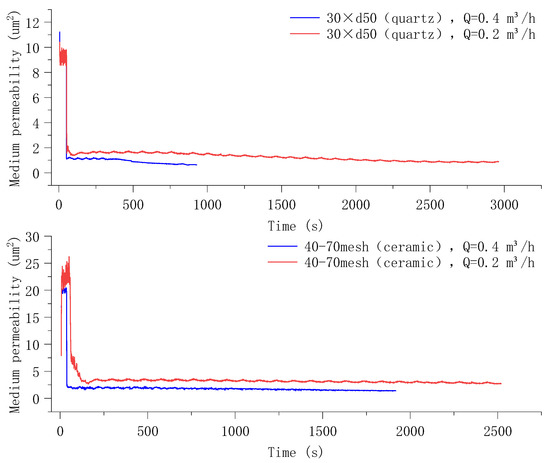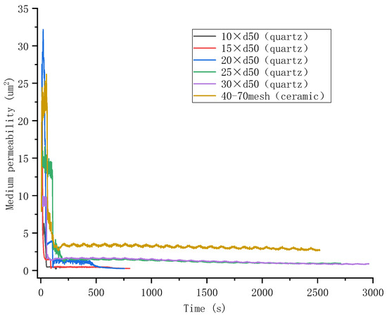 The median grain size of the ceramic-particle-packed layer (40~70 mesh) is comparable to that of the quartz sand in Scheme S5, so the ceramic-particle-packed layer (40~70 mesh) is equivalent to Scheme S5. The experimental curves (Figure 13) show similar laws to those of Scheme S5 of the quartz-sand-packed layer (Figure 10). However, the difference lies in the better anti-plugging performance and fluid-flow performance of ceramic particles. Figure 14 compares two packed layers of quartz sand and ceramic particles, revealing that the ceramic particles show the highest final permeability, and that their anti-plugging performance is superior to that of quartz sand under the same scheme.