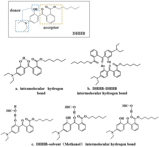 The photophysical properties of DHHB are related to whether it can form hydrogen bonds with solvents and the formed type of hydrogen bonds. As shown in Figure 2, the following three types of hydrogen bonds formed in the DHHB solution system: intramolecular hydrogen bonds of DHHB (Figure 2a), intermolecular hydrogen bonds of DHHB (Figure 2b), and intermolecular hydrogen bonds between DHHB and the solvent (Figure 2c). To explore the influence of the solvent effect of the hydrogen bond on DHHB, the concentration of DHHB was fixed at 5 μg/mL, and the aprotic solvents n-hexane and carbon tetrachloride were selected as aprotic solvent representatives. Their dielectric constants were 1.58 and 2.24, respectively. Methanol, ethanol, and isopropyl alcohol were selected as protic solvent representatives; their dielectric constants were 33.6, 24.3, and 19.92, respectively. The UV absorption spectra and fluorescence spectra were determined.
