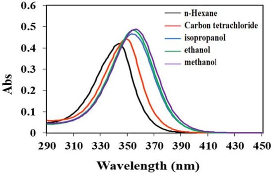 According to our theoretical analysis, the hydrogen bond state of the DHHB molecules in aprotic solvents (n-hexane and carbon tetrachloride) was dominated by a DHHB intramolecular hydrogen bond (Figure 2a) and an intermolecular hydrogen bond (Figure 2b). Methanol, ethanol, and isopropanol were the protic solvents; their polarity and capacity to form hydrogen bonds decreased in order. The solvents could both accept and supply protons to form hydrogen bonds (Figure 2c). Therefore, all three types of hydrogen bonds existed. As shown in Figure 3, the maximum absorption wavelengths (λmax) of DHHB were 344 nm and 348 nm in n-hexane and carbon tetrachloride, respectively; λmax redshifted to 353 nm~356 nm in methanol, ethanol, and isopropanol, and the absorbance significantly increased. This phenomenon may have been a result of the formation of the P-π conjugation effect, which reduces the energy required for electrons to transition from a ground state to an excited state.