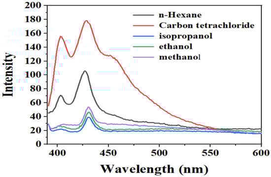 Related research [14] has shown that the formation of intermolecular hydrogen bonds in protic solvents leads to fluorescence bursts. As the ability to form hydrogen bonds increased, the quenching was more pronounced. Therefore, the fluorescence spectra of DHHB in different solvents were determined. As shown in Figure 4, the fluorescent intensity of the sample in protic solvents was lower than that in aprotic solvents. The fluorescent intensity of the DHHB molecule in carbon tetrachloride was 178; it decreased to 53, 51, and 40 in isopropanol, ethanol, and methanol, respectively. This indicated that the DHHB molecule underwent fluorescence quenching in the protic solvents and that the degree of quenching increased in turn. We speculated that the formation of molecular hydrogen bonds in protic solvents caused the excited-state molecules to release lower energy through intermolecular interactions and energy conversion, resulting in fluorescence quenching. In this process, due to a reduction in the energy of the excited-state molecules, the energy required for the electron to transition from the ground state to the excited state increased. This indicated that the λmax redshift and the intensity increase in the UV absorption spectra were due to the formation of hydrogen bonds in the structure. A weak peak appeared at the shoulder of 460 nm in both n-hexane and carbon tetrachloride. Due to the low fluorescent intensity in n-hexane, the peak at 460 nm was not obvious; there was no such peak in the protic solvent. This may have been due to the formation of intermolecular hydrogen bonds between DHHB and the protic solvent. The 460 nm peak disappeared as a result of fluorescence quenching.