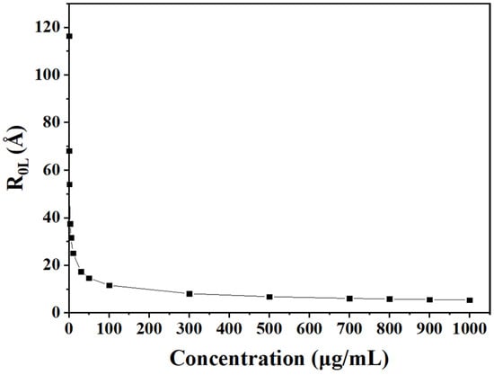 Based on Forste’s energy transfer theory, the intermolecular distances of DHHB at different concentrations in an aprotic solvent were calculated using Formula (2). The results are shown in Figure 5. To investigate the influence of molecular spacing on the hydrogen bond state of DHHB molecules, the UV spectrum was tested by setting different concentrations of DHHB in the aprotic solvent (carbon tetrachloride); the change in the molar absorption coefficient was then calculated.