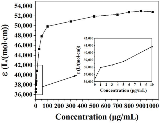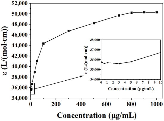 As shown in Figure 9, in the low-concentration range (0.1 μg/mL to 5 μg/mL), the molar absorption coefficient of the system slowly increased. The increased rate was higher than that of the DHHB–carbon tetrachloride system. This may have been due to the formation of intermolecular hydrogen bonds between the methanol and DHHB molecules. When the concentration of DHHB increased from 5 μg/mL to 100 μg/mL, the molar absorption coefficient significantly increased. When the concentration of DHHB was greater than 100 μg/mL, the increase in the molar absorption coefficient slowed until it reached equilibrium. This result was mainly due to the formation of hydrogen bonds between the methanol and DHHB molecules in the methanol solvent, which accelerated the saturation of hydrogen bonds in the system. This indicated that the formation of solvent–DHHB intermolecular hydrogen bonds could improve the UV absorption of DHHB.