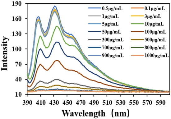 A fluorescence spectrophotometer was used to set the excitation slit and emission slit of the fluorescence spectrophotometer to 5 nm. The excitation wavelength was 377 nm, the emission wavelength was 377 nm, the scanning step size was 1 nm, and the scanning range was 390 nm~550 nm. Fluorescence scanning was performed on a solution pre-pared as per Section 2.2.1 at a temperature of 25 °C.