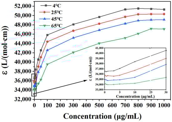 Figure 8 demonstrates that the molar absorption coefficient of the system decreased with an increase in temperature at all concentrations. In the low-concentration range (≤10 μg/mL), an inflection point was observed where the molar absorption coefficient significantly increased when the concentration and temperature increased. At 4 °C, the molar absorption coefficient of the system began to increase when the concentration was higher than 3 μg/mL; this may have been due to the formation of intramolecular hydrogen bonds at this concentration. With an increase in the concentration, the molecular spacing decreased, the number of intermolecular hydrogen bonds increased, and the molar absorption coefficient gradually increased. When the temperature was increased to 25 °C and 45 °C, the inflection points of the molar absorption coefficient increased to 5 μg/mL. When the temperature was increased to 65 °C, the thermal motion significantly increased, further weakening of the stability of the intermolecular hydrogen bonds; the inflection point increased to 10 μg/mL. At temperatures of 4 °C, 25 °C, and 45 °C, the amplification of the molar absorption coefficient slowed when the concentration was higher than 100 μg/mL. When the concentration was increased to 800 μg/mL, the molar absorption coefficient tended to be stable. This indicated that the DHHB–DHHB intermolecular hydrogen bonds reached saturation after this concentration and that the molecules were stacked in the form of multipolymers. This concentration increased to 900 μg/mL when the temperature was raised to 65 °C.