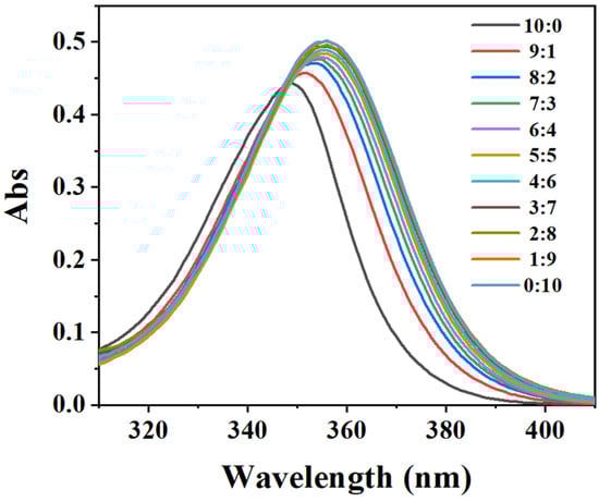 Figure 10 demonstrates that, as the volume fraction of methanol increased, the maximum absorption wavelength of the system shifted to red; thus, in turn, the maximum absorbance increased. When the volume ratio reached 3:7, the absorbance curves did not significantly change. With a continual increase in the volume of methanol, a high degree of overlap occurred. The integrated area of the UVA region significantly increased when the volume fraction of methanol increased from 0 to 20%, as shown in Figure 11. This might have been due to the gradual formation of hydrogen bonds between the methanol–DHHB molecules. With an increase in the volume fraction of methanol, the increase in the integral area began to slow down. This may have contributed to the number of free DHHB molecules that could form intermolecular hydrogen bonds with the solvent molecules, which decreased as the volume of protic solvent increased at a fixed DHHB concentration. When the volume fraction of methanol was increased to 70%, the integrated area effectively reached equilibrium; thus, we assumed that the methanol–DHHB intermolecular hydrogen bonds had reached saturation. This demonstrated that the formation of solvent–DHHB intermolecular hydrogen bonds was beneficial to improving the UV absorption performance of DHHB.