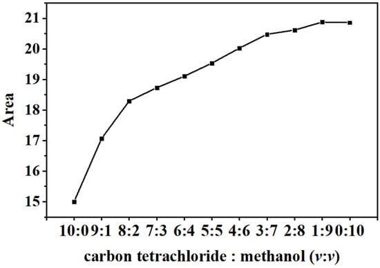 Integrated area of UVA region of DHHB solution at different carbon tetrachloride/methanol volume ratios.