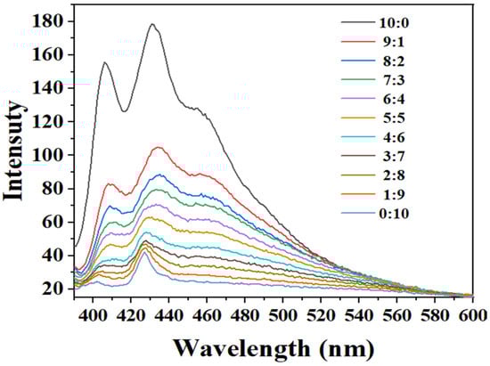 The change in the hydrogen bond state of the DHHB molecules under different volume fractions was verified by using fluorescence spectroscopy. As shown in Figure 12, the fluorescent intensity of the system rapidly decreased from 187 to 87 as the volume fraction of methanol increased from 0 to 20%. This indicated that the number of solvent–DHHB intermolecular hydrogen bonds in the system had rapidly increased. When the volume fraction of methanol increased to 70%, the fluorescent intensity decreased to 49, indicating that the number of hydrogen bonds between the solvent and DHHB molecules had gradually reached saturation in this process. When the methanol volume fraction increased, the fluorescent intensity changed slightly. The experimental results were consistent with the integrated area results, verifying that the methanol–DHHB molecular hydrogen bond was beneficial to enhancing the UV absorption performance of DHHB.