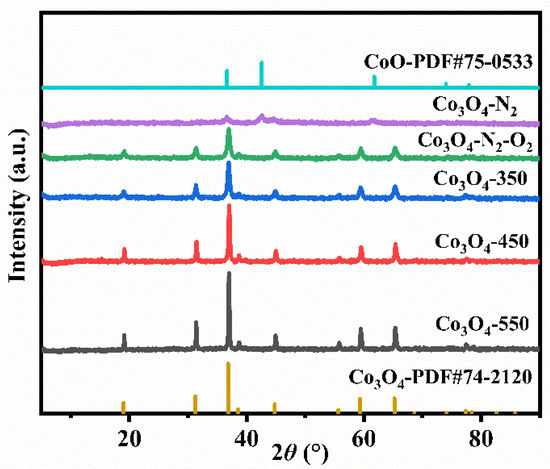 Co-BTC was calcined in air at different temperatures (350 °C, 450 °C, and 550 °C) for 2 h at a heating rate of 2 °C·min−1; the products were named Co3O4-350, Co3O4-450, and Co3O4-550, respectively. Then, the Co-BTC was calcined at 450 °C in N2 for 2 h at a heating rate of 2 °C·min−1 to obtain Co3O4-N2. Additionally, the sample of Co-BTC was first treated at 450 °C in N2 for 1 h and then treated at 350 °C in O2 for 1 h, and the product was named Co3O4-N2-O2. As a comparison, 0.012 mol of the Co(NO3)2·6H2O was treated at 450 °C in N2 for 1 h and then treated at 350 °C in air for 1 h to obtain Co3O4-P.