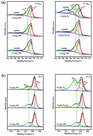 Figure 3b shows the O 1s XPS spectra of the samples, which could be divided into two peaks at binding energies of 529.36 eV and 531.03 eV, respectively. This could be ascribed to lattice oxygen (Olatt) and adsorbed oxygen species on oxygen vacancies (Oads) [31], where the Co3O4-N2 catalyst shifted the position of the oxygen species peak, so that the peaks with binding energies at 529.66 eV and 531.54 eV represented lattice oxygen species and adsorption oxygen, respectively. The Oads/Olatt molar ratios were determined based on the area-fitted curve peaks of the O 1s XPS spectra; these are listed in Table 2 and Table 3. It can be seen that the ratio of Oads/Olatt decreased as the calcination temperature of the material increased, indicating that high-temperature calcination was not conducive to the accumulation of adsorbed oxygen in the material. Previous studies have shown that surface-adsorbed oxygen (Oads) is related to surface defects and that higher contents of Oads facilitate the uptake and activation of gas-phase oxygen molecules by the catalyst, promoting the degradation of pollutants [32,33]. In addition, it is worth noting that Co3O4-N2 had the highest Oads/Olatt molar ratios. However, from Figure S3 and Table 3, it can also be seen that the surface C, O, and Co contents of the Co3O4-350 and Co3O4-N2-O2 catalysts were essentially the same, with the highest elemental content being that of O, accounting for about 50% of the total. In contrast, the Co3O4-N2 catalyst had the largest amount of elemental C but only 23% of the total amount of O. This was because the Co3O4-N2 catalyst was prepared in the absence of oxygen, so most of the organic matter in the ligand was stored as carbon inside the catalyst, and the metal Co inside the material could not be fully oxidized, resulting in a lack of sufficient O in the catalyst itself, so that the Co3O4-N2 catalyst had the highest Oads/Olatt molar ratios but the lowest total amount of Oads compared with other catalysts. This phenomenon can also be seen in Figure S1.