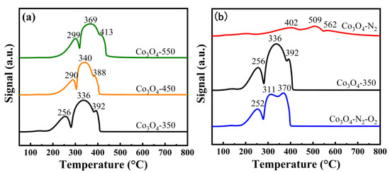 The reducibility of a sample was highly related to its catalytic performance. Figure 4 illustrates the H2-TPR profiles of all synthesized catalysts. Three distinct reduction peaks were found for all catalysts, in which the low-temperature-region reduction peak indicated the reduction of Co3+ to Co2+, the medium-temperature-region reduction peak indicated the reduction of Co2+ to Co+, and the high-temperature-region reduction peak indicated the reduction of Co2+ to Co0 [34]. From Figure 4a, it can be seen that the reduction peak of the catalyst gradually moved towards the high-temperature region as the calcination temperature increased, indicating that the reduction effect of the material deteriorated under high-temperature calcination conditions; this may be related to the particle size of the catalyst, as the XRD results indicated that the particle size of the catalyst became larger as the calcination temperature increased. It has been reported in the literature that the reduction peak tends to move towards the high-temperature region as the particle size increases [35]. Figure 4b shows the reduction peaks of the catalysts prepared in different calcination atmospheres. A comparison reveals that Co3O4-N-O2 had the lowest reduction temperature. This finding may be related to the specific surface area of the material and the abundance of Co3+ active centers, i.e., the high specific surface area of the material made it easier to expose a large number of Co3+ active sites on the external surface. Compared with Co3O4-N2-O2, the reduction peak of Co3O4-N2 was very weak, because the Co in the Co3O4-N2 catalyst existed mainly in the form of CoO and, thus, lacked a sufficient number of Co3+ active sites.
