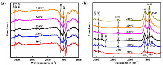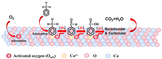 To further investigate the possible reaction pathway of toluene oxidation on the Co3O4-N2-O2 catalyst and any intermediates in the degradation of toluene, in situ DRIFT spectra of the catalyst at different temperatures under Ar and air conditions were obtained, as shown in Figure 6. It was found that, after a period of introducing toluene at room temperature, characteristic peaks of toluene appeared: at 3091 and 3035 cm−1, attributed to unsaturated C-H bonds on the benzene ring; and at 2932 cm−1, attributed to saturated C-H bonds on toluene’s methyl groups. In addition. 1585 and 1495 cm−1 were found to be the benzene ring skeleton vibration peaks of toluene [36,37,38], indicating that toluene was adsorbed on the surface of the catalyst. Figure 6a shows that the characteristic peak of toluene did not change significantly with increasing temperature under an Ar atmosphere, meaning that the catalyst had little degradation effect on toluene under an Ar atmosphere. Conversely, under air-supply conditions, as shown in Figure 6b, the characteristic peak of toluene disappeared with the increase in temperature. At 140 °C, new bands appeared at 2840 and 2721 cm−1, which could possibly be attributed to adsorbed benzaldehyde [39]; in addition, bicarbonate species (1356 cm−1) also started to appear [40]. New characteristic peaks also appeared at 1563 and 1340 cm−1 when the temperature reached 200 °C; these were attributed to benzoic acid and carbonate species, respectively [41,42]. As the temperature increased, benzaldehyde was further oxidized to benzoic acid, and bicarbonate species were gradually oxidized to carbonate species. The characteristic peaks of 1431 cm−1 for carboxylate species such as benzoic acid, and of 2340 and 2360 cm−1 for CO2, became progressively larger as the temperature increased under an air atmosphere [38], meaning that more and more benzoic acid and CO2 were generated and accumulated on the catalyst’s surface as the temperature increased.