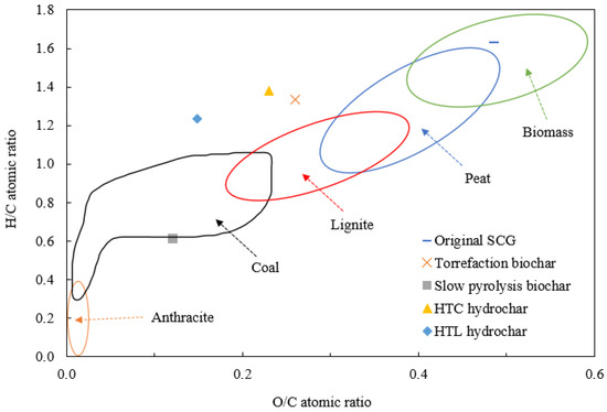 Table 2 also summarizes the O/C and H/C atomic ratios of biomass, biochar, and hydrochar. By plotting O/C and H/C in a van Krevelen diagram, a comparison of biomass, biocarbon materials, and coal at different ranks can be developed [27], as depicted in Figure 1. Clearly, slow pyrolysis biochar falls within the region of coal and can be considered as a solid biofuel with comparable quality to coal. Examining O/C and H/C ratios, it was found that the carbonization degree of biochar/hydrochar was affected by demethanation, dehydration, and decarboxylation. For example, the decreased H/C ratio could be due to the formation of CH4 via demethanation, while a drop in the O/C ratio could be caused by the formation of CO2, carboxylic acids, and carbonyls by decarboxylation. Based on the O/C ratio, the carbonization degree of the four char materials is in the order of slow pyrolysis > HTL > torrefaction ≈ HTC.