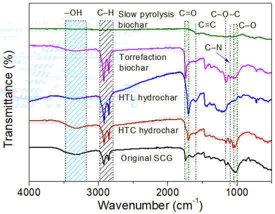 FTIR analysis was carried out to characterize the functional groups on the surface of the original SCGs, biochar, and hydrochar, as shown in Figure 3. The original SCGs were characterized by -OH (3335 cm−1), C-H (2920 cm−1 and 2850 cm−1), C=O (~1700 cm−1), C=C (1605 cm−1), C-O-C (1161 cm−1), C-N (1097 cm−1), and C-O (1027 cm−1) bonds, which were comparable with the SCGs used in previous studies [38]. Torrefied SCGs, HTC hydrochar, and HTL hydrochar shared some functional groups with the original SCGs such as -OH, C-H, C=O, and C-O-C bonds. The functional groups in torrefied SCGs were very comparable with those of the HTC hydrochar. However, HTL hydrochar exhibited more complete carbonization compared to torrefied SCGs and HTC hydrochar, as evidenced by its weaker peak of the -OH group, absence of the C-O bond, and the presence of the C=C bond. As for slow pyrolysis biochar, its characteristic peaks were significantly less abundant than the others, which implied that the carbonization during SCG slow pyrolysis was extremely thorough. Mukherjee et al. pyrolyzed SCGs under different temperatures and found that the characteristic peaks gradually disappeared as the temperature increased from 400 °C to 600 °C [41].