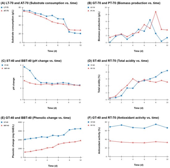 Change of substrate concentration, biomass production, pH, total acidity, phenolic, and antioxidant activity during Kombucha fermentation performed on media containing different initial sugar concentrations. (A) Substrate consumption vs. time with sage tea (ST-70) and linden tea (LT-70). (B) Biomass production vs. time with green tea (GT-70) and pomegranate tea (PT-70). (C) pH change vs. time with sage tea (ST-40) and blueberry tea (BBT–40). (D) Total acidity vs. time with sage tea (ST-40) and rosehip tea (RT-70). (E) Phenolic change vs. time with green tea (GT-40) and blueberry tea (BBT-40). (F) Antioxidant activity vs. time with green tea (GT-40) and rosehip tea (RT-70).