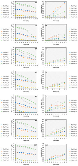 The actual and estimated total acidity values are also plotted vs. time and shown in Figure 2. It is detected that the values of R2 range from 0.4809 to 0.9526. It can be said that those with R2 values higher than 0.75 (in this case, they are ST-40, ST-70, LT-10, GT-10, GT-70, AT-10, AT-40, AT-70, RT-10, PT-10, PT-40, PT-70, BBT-10, and BBT-40) are adequately fitted by the LPM (Table 3). Therefore, most of the Kombucha fermentation from different tea extracts supplemented with different concentrations of sucrose is satisfactorily fitted by the LPM with the R2 value greater than 0.75. Moreover, α and β values, which can change based on the fermentation circumstances, were estimated (Table 3). If α ≠ 0 and β = 0, then the total acidity is associated with substrate consumption. If α = 0 and β ≠ 0, then the total acidity is non-associated with substrate consumption. The values of β vary from −0.0075 to 0.0076%/gS.d, which are so close to zero, while the values of α range from 0.0142 and 0.2584%/gS. The values of α are 5.87 to 360.19 times greater than those of β (Table 3). Therefore, we can say that the total acidity is associated with substrate consumption. Mahdinia et al. [35] studied the kinetic modeling of Menaquinoe-7 fabrication from glucose and glycerol in the biofilm reactor using the LPM. The model parameters of the LPM, which are α and β, were calculated to be −0.138 mg/g and 0.00010 mg/g/h for the production in the glucose-based medium and −0.089 mg/g and 0.00301 mg/g/h for the production in glycerol-based medium, respectively. Therefore, the values of α were 1380- and 29.57-fold higher than those of β, respectively, showing that Menaquinoe-7 fabrication was associated with substrate consumption [35], as it is in the current study. To the best of our knowledge, there is no study regarding the kinetic modeling of Kombucha fermentation using different tea extracts enriched with different concentrations of sucrose as a carbon source. Therefore, this study is important in terms of contributing to science because of the information it contains.