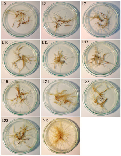 The roots were formed within 2–4 weeks of the co-culturing of the explants with A. rhizogenes. The resulting roots were isolated and cultured individually. During the cultivation on hormone-free media, some of the root lines became dark brown and stopped their growth. A similar result was observed, for example, when the hairy root lines of Saussurea involucrata were obtained [15]. Ten lines were used for further investigation: L0, L3, L7, L10, L12, L17, L19, L21, L22, and L23 (Figure 1). The roots of these lines were thin, with light yellow coloring on the young growing parts and a brown coloring on the older ones, as well as in S. baicalensis (Figure 1). Such root culture coloring is characteristic of members of the genus Scutellaria [11,16,17].