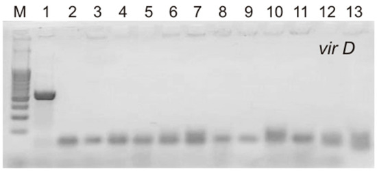 PCR products of the amplification of the virD primers in hairy roots of S. pycnoclada and S. baicalensis. M—DNA marker (100 bp ladder); 1—plasmid DNA of A. rhizogenes strain A4 (positive control); 2—negative control (water); 3–12—genomic DNA of hairy roots lines of S. pycnoclada (L0, L3, L7, L10, L12, L17, L19, L21, L22, and L23, respectively); 13—genomic DNA of hairy roots of S. baicalensis.