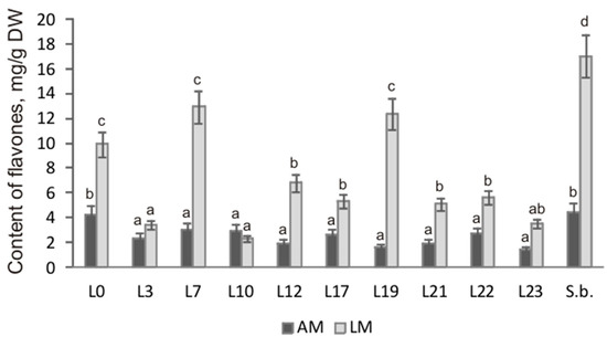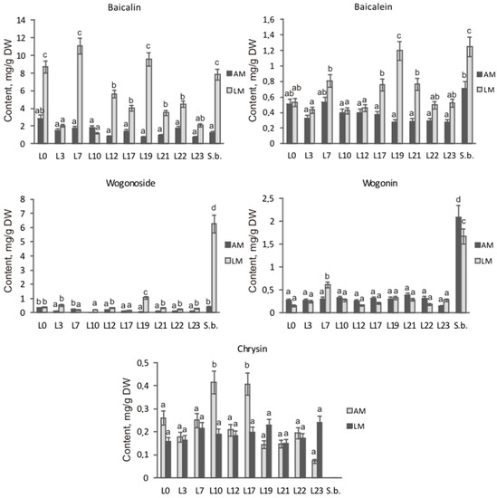 Content of the main flavones in the hairy roots of S. pycnoclada (L0–L23) and S. baicalensis (S.b.) cultured on liquid and agar media. AM—agar medium; LM—liquid medium. Different letters indicate a significant difference between the means (one-way ANOVA, p < 0.05).
