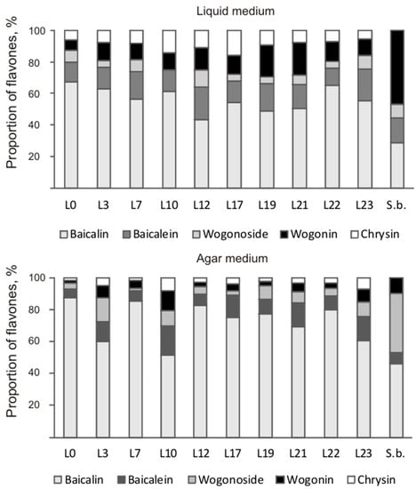 The ratio of the main flavones in S. pycnoclada (L0–L23) and S. baicalensis (S.b.) hairy roots cultured on liquid and agar media.