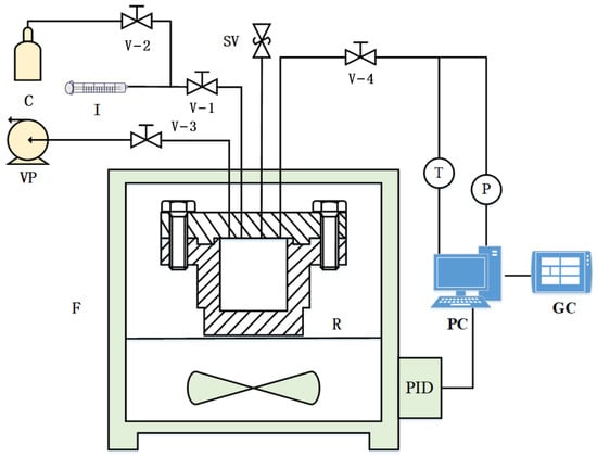 Diagram of the experimental system. R: Reactor; F: Heating furnace; V: Control valve; C: Gas cylinders; I: Liquid injector; P: Pressure sensor; SV: Safety valve; VP: Vacuum pump; PID: Temperature controller; GC: Gas chromatograph; T: Thermocouple; PC: Computer for data collection.