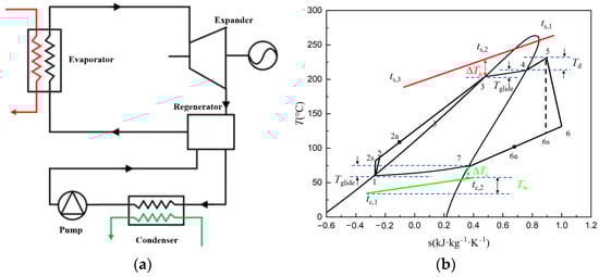 The focus on industrial waste heat recovery and the utilization of renewable energy has been intensified as a potential solution to pressing energy and environmental challenges. Compared with other cycle forms such as the steam Rankine cycle, the organic Rankine cycle (ORC) uses organics as working fluids and can have good performance at 150 °C to 300 °C, so it is a potential heat utilization technology for industrial waste heat and renewable energy [,]. ORCs have been widely used in solar power, geothermal power, biomass power, and industrial waste heat recovery systems because of their high thermal efficiencies and easy realization. ORCs are applicable across a wide range of temperature intervals. The low- and medium-temperature heat sources, such as geothermal energy, have the main position in the installed capacity of commercial ORC systems in the world []. The ORC systems with high-temperature heat sources have attracted much interest because of their higher thermal efficiency [,,,].