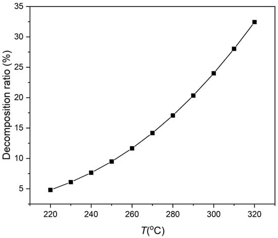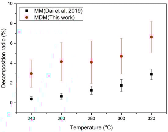 The decomposition ratios of MM [] and MDM at different temperatures are shown in Figure 3. The results indicated a significant influence of temperature on MDM’s thermal decomposition. The decomposition ratio of MDM increased with the rise in heating temperature. Thermal decomposition occurred at 240 °C, recording an MDM decomposition ratio of 2.95%. As the temperature continued to increase, so did the decomposition ratio, reaching 6.64% at 320 °C. The decomposition ratios of MM at different temperatures in reference [] were measured using the same experimental methodology as this study, so could be compared with the decomposition ratios of MDM directly. The results revealed that within the temperature range of 240 to 320 °C, the decomposition ratio of MM also increased with the rise in heating temperature, and the decomposition ratio of MM was 0.45% at 240 °C and 2.83% at 320 °C, which was significantly lower than MDM. Thus, MDM had worse thermal stability compared with MM.