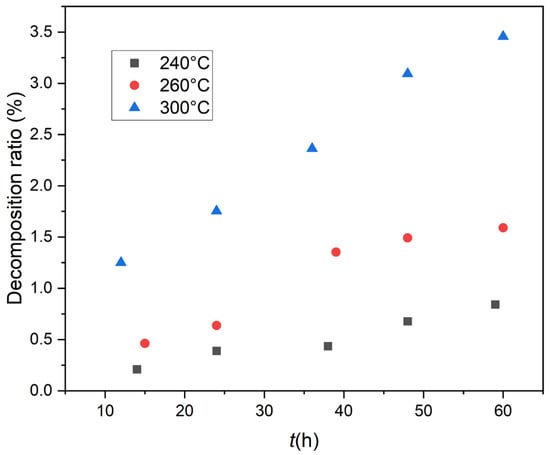 Decomposition ratios of MM at 240 °C, 260° C, and 300 °C.