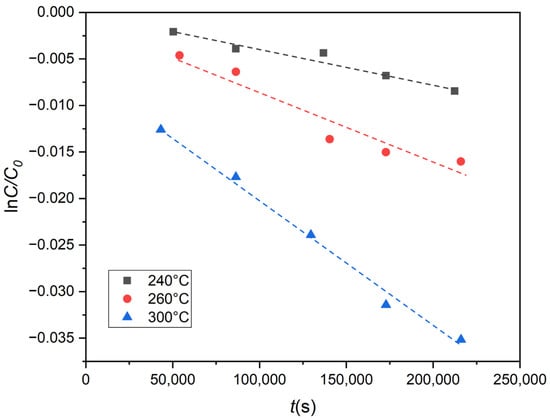 lnC/C0-t curves of MM at 240° C, 260 °C, and 300 °C.